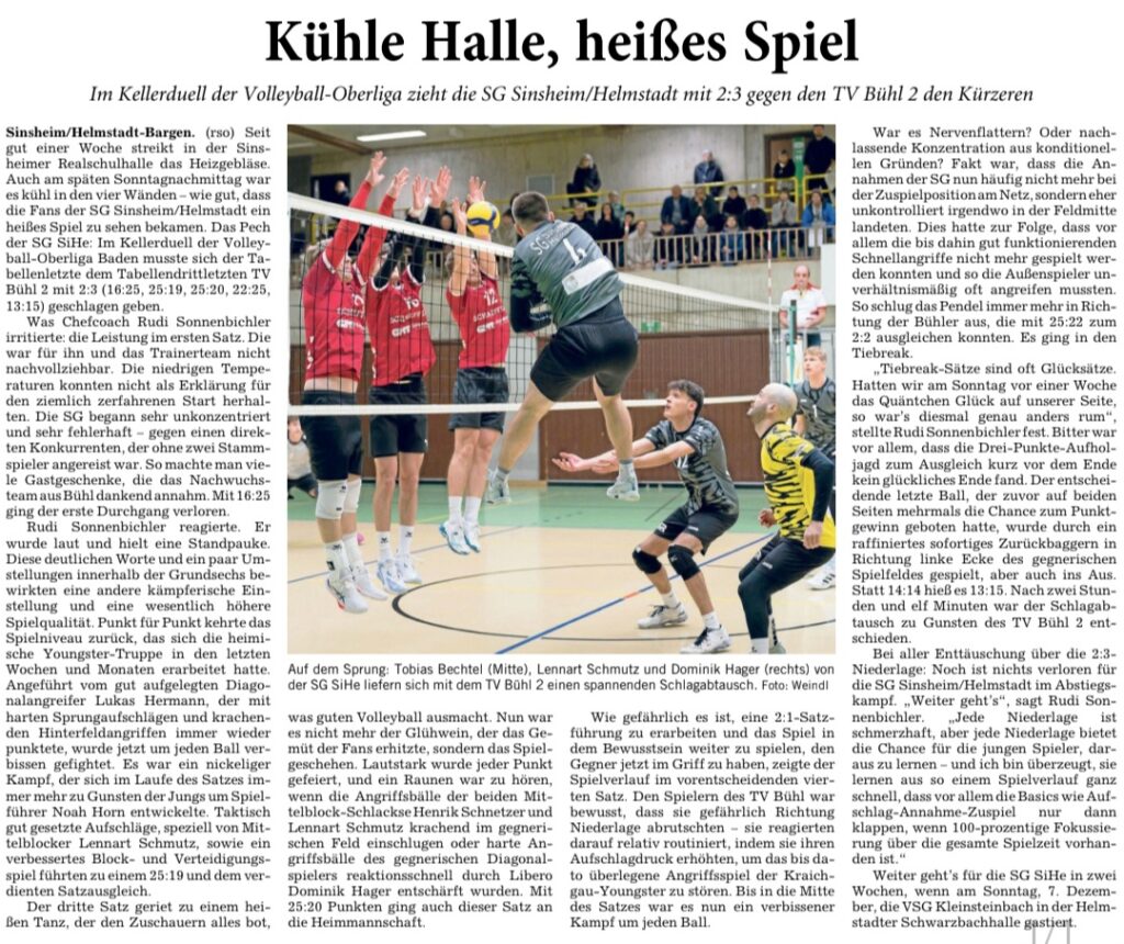 H1: Heißer Fight gegen TV Bühl 25. November 2025 / Herren1 Allgemein Vorheriger Beitrag Ungeschlagen an der Tabellenspitze Nächster Beitrag H2: Siegesserie eiskalt ausgebaut